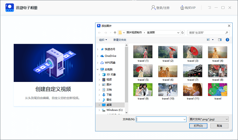 2、接下来,我们打开软件,点击「创建自定义视频」,选择照片添加,开始制作电子相册。