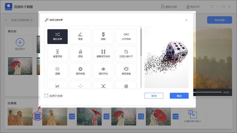 4、然后,我们点击故事集菜单栏中的按钮,设置照片之间的切换效果,总共有30种效果,右侧还有效果预览,可以试试哪种更适合自己。
