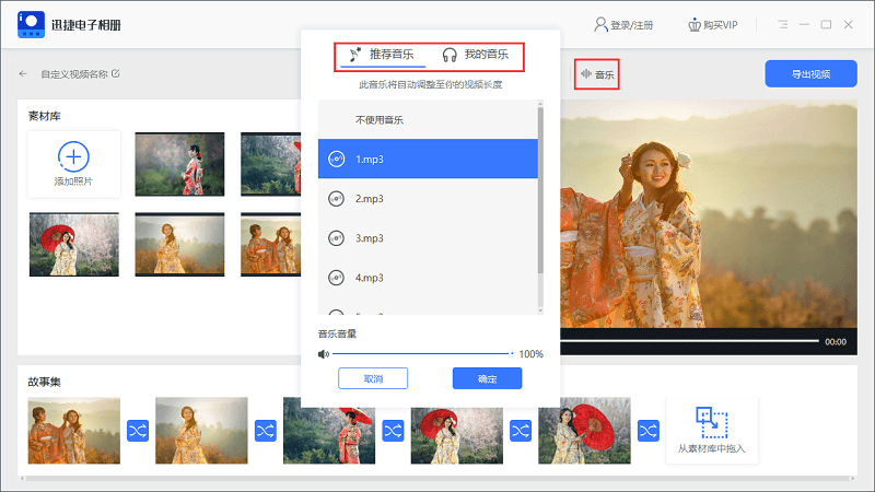 5、依次设置完照片的切换效果后,我们点击右上角的「音乐」按钮,设置电子相册的背景音乐。背景音乐可以选择官方推荐的音乐,也可以自己上传音乐文件。