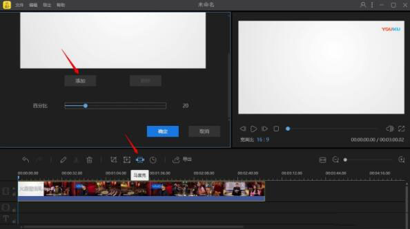 单击视频轨道上的视频,点击工具栏中的【马赛克】按钮,弹出方框,点击【添加】,视频界面会出现一个浅黄色矩形,