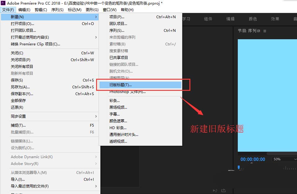 2、将新建的颜色遮罩拖到时间轴的视频轨道1作为背景,然后执行文件菜单中的新建旧版标题命令。