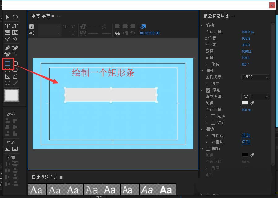 3、在弹出的旧版标题窗口中,选择矩形工具,用矩形工具在画面的合适位置中绘制一个矩形条出来。