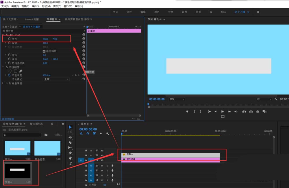 4、关闭旧版标题窗口,将矩形条拖到视频轨道2上,并在效果控件中设置位置的参数将矩形条调整到画面的合适位置。