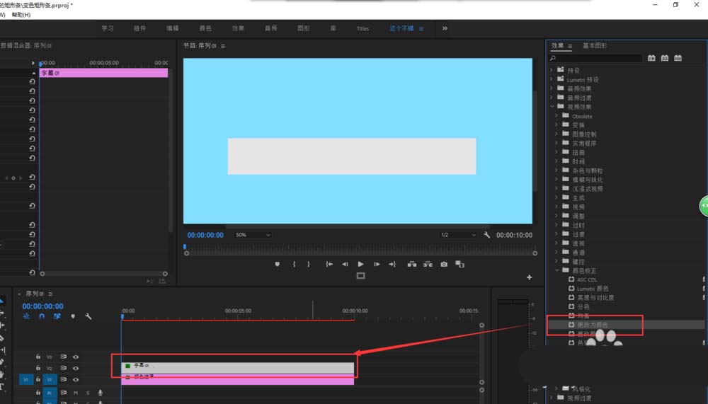 5、找到视频效果——颜色校正——更改为颜色这个内置效果,将这个内置效果添加给矩形条图形。