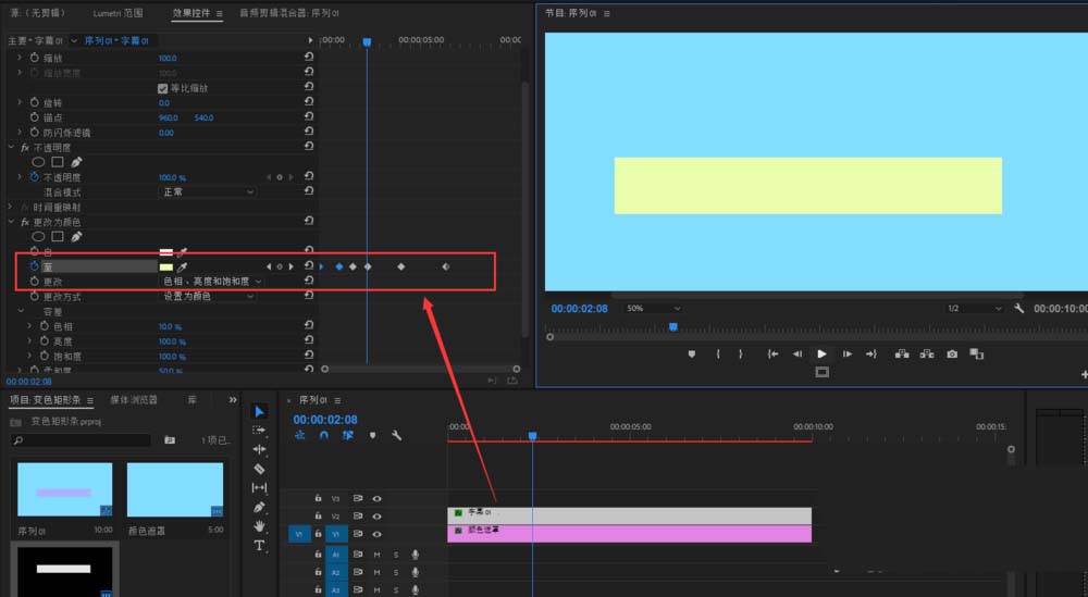 6、选中矩形条,在效果控件中找到更改为颜色命令,将更改选择色相,亮度和饱和度,然后设置至的关键帧动画,没移动一段时间更改颜色并创建关键帧。最后播放时间轴一个表色的矩形条动画就完成了。