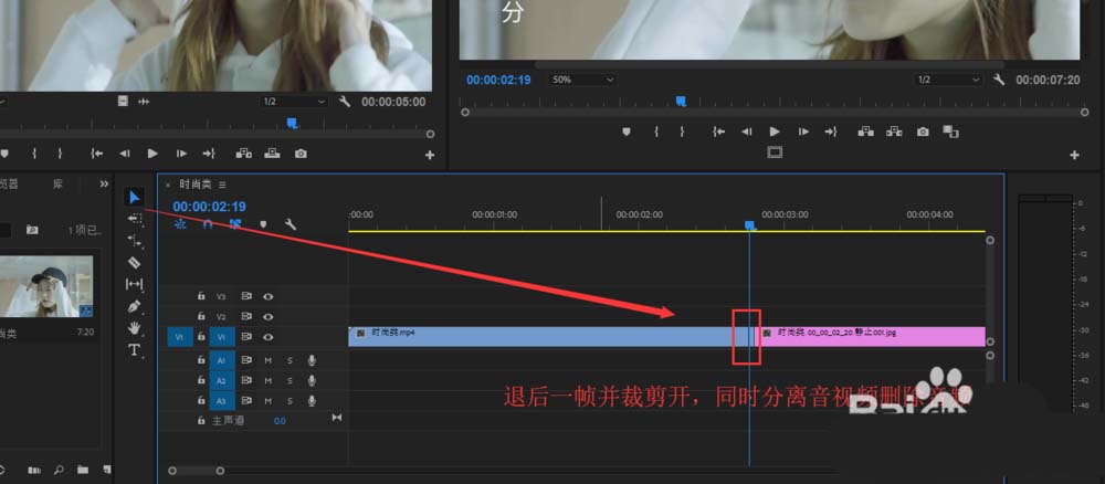 2、用裁剪工具将单帧后面的部分裁剪开并删除,然后将导出的单帧图片素材拖到后视频轨道上。
