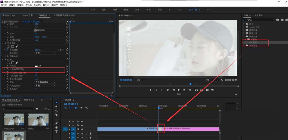 4、为中间的那过渡的一帧时间添加闪光灯效果,然后在效果控件中设置闪光灯的与原始图像混合为30%。