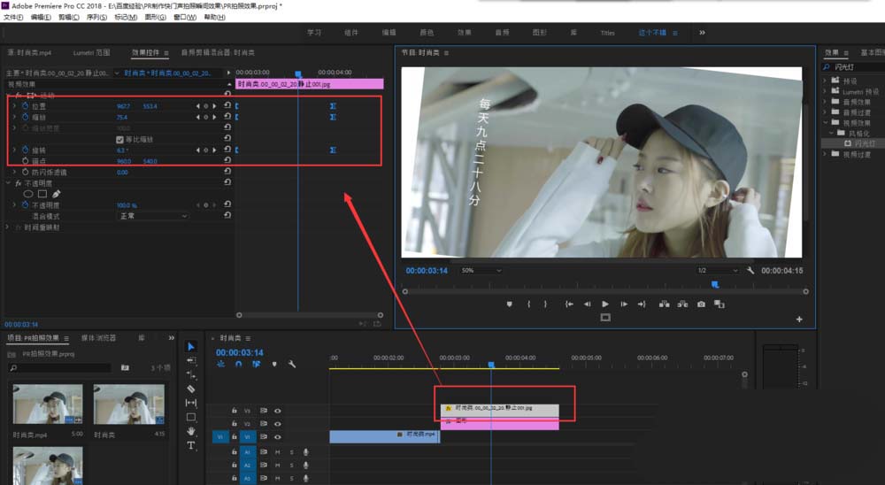 6、将单帧图片拖到矩形的上面视频轨道,让矩形作为背景,然后为单帧图片设置位置、缩放和旋转的关键帧动画效果。最后你还可以添加一个拍照瞬间的咔擦的音效就大功告成了。
