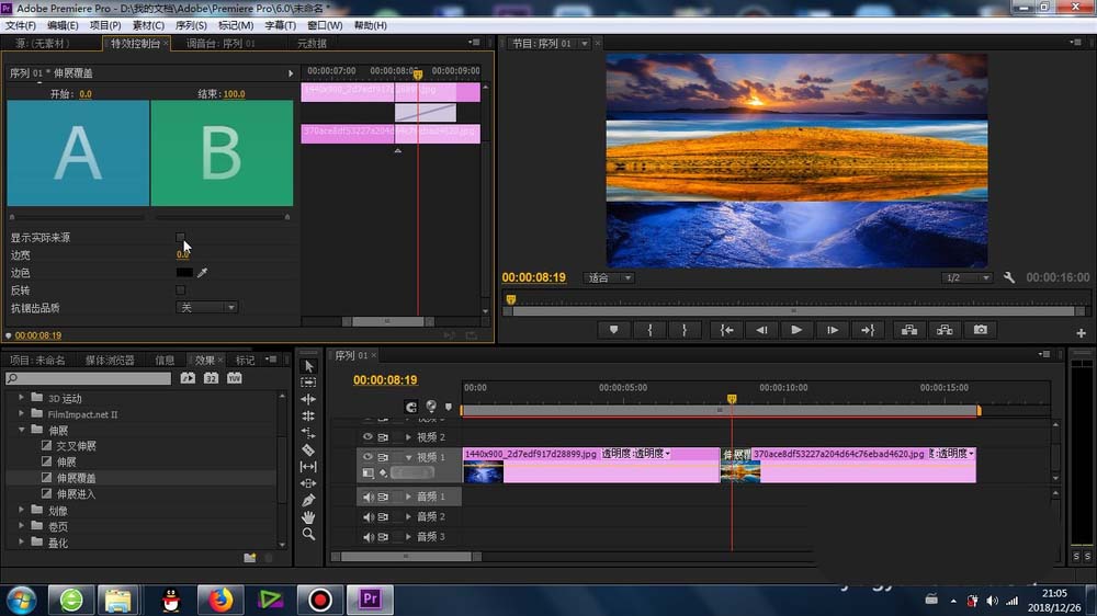 1、首先就是伸展覆盖 效果的位置,是在效果里面的-视频切换-伸展-伸展覆盖- 里面