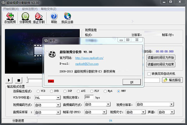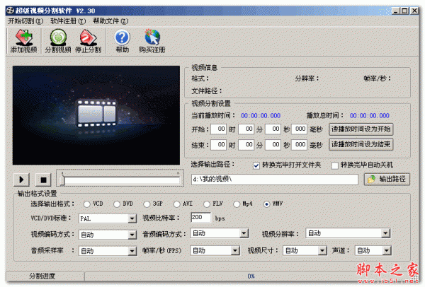 超级视频分割软件是由mp4soft打造的一款专业的视频分割工具,软件支持分割、剪切AVI、MPEG、RM、ASF、WMV、3GP 或 MP4视频文件的视频片断,支持用户在浏览视频文件的同时,按照时间将您喜欢的片断轻松截取下来并直接剪切,只需拖动软件设置“开始”、“结束”按钮标记来指定分割范围,就可以将整个媒体文件分割为若干份,同时,软件输出格式自由选择,您可以自定义设置将视频分割成各类输出格式,是最佳的视频分割神器。