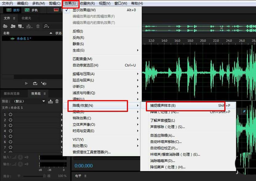 2、选择一段没人声,效果→降噪→捕捉噪声样本