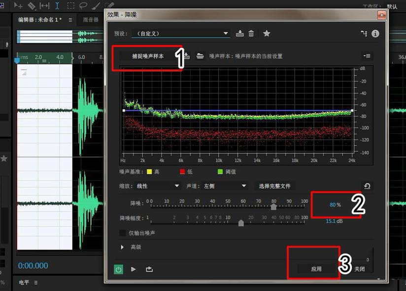 3、效果 降噪选择框,2降噪80%,3点应用,效果可以全选重复操作