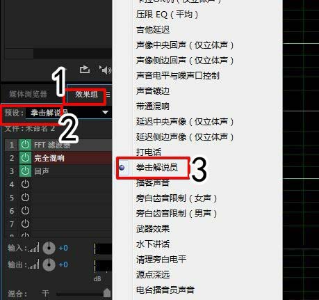 4、降噪处理完后,找到1效果组2点预设里找到3拳击解说员