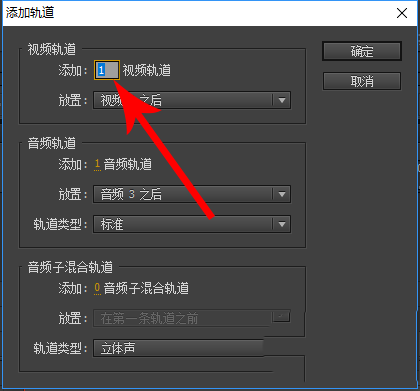 4、打开“添加轨道”弹窗以后,点击视频轨道的数字1,然后输入想要添加的轨道数2