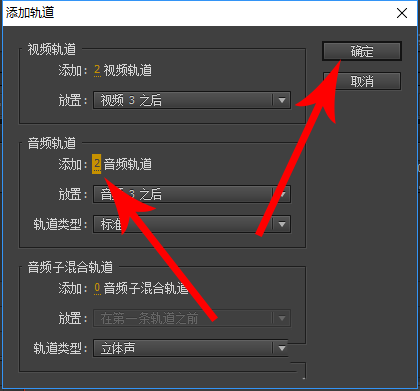 5、然后点击音频轨道的数字1,接着输入想要添加的轨道数2,最后再去点击“确定”