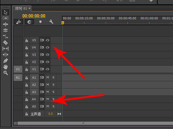 6、返回到pr工作区以后,在“序列”面板中就可以看到新添加的2条视频轨道和2条音频轨道了