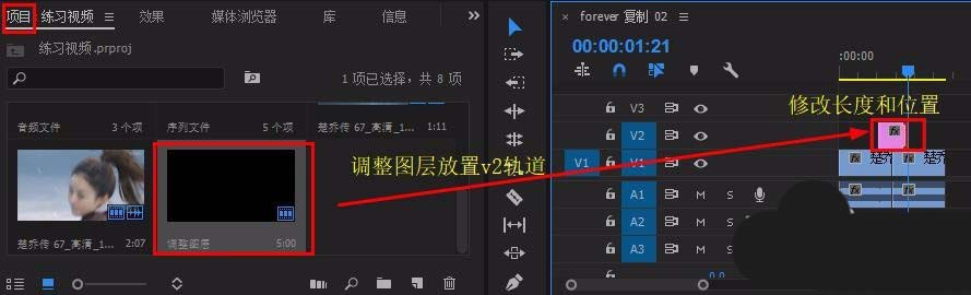 3、在“项目”面板空白处右击鼠标,选择“新建项目”-“调整图层”,将调整图层拖到v2轨道至视频1和视频2中间处