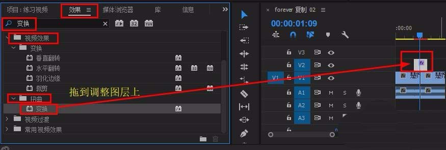 4、在“效果”面板搜索栏输入“变换”,将其拖到调整图层上