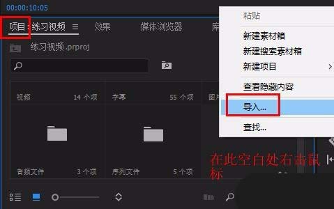 1、打开pr,在“项目”面板右击鼠标,选择“导入”,将两段视频导入