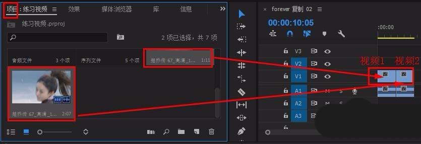 2、拖拽视频1、视频2到v1轨道上