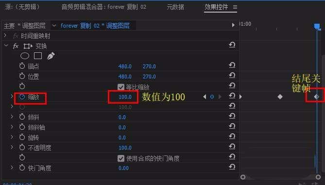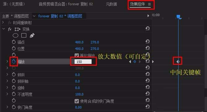 5、选中调整图层,在其“效果控件”面板中找到“变换”。将时间标尺移到调整图层开始处,打开“变换”-“缩放”前的动画图标,建立开始关键帧,数值不变