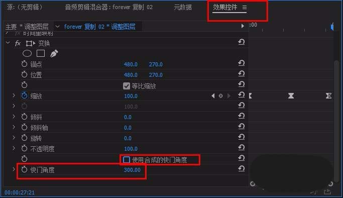 9、取消勾选“使用合成的快门角度”,修改“快门角度”为300(可自定,也可以为它设置关键帧,方法同上),播放查看效果即可(上传动图又失败、、我不想说话了--、)