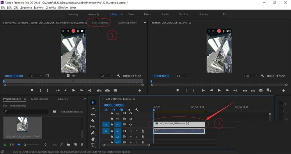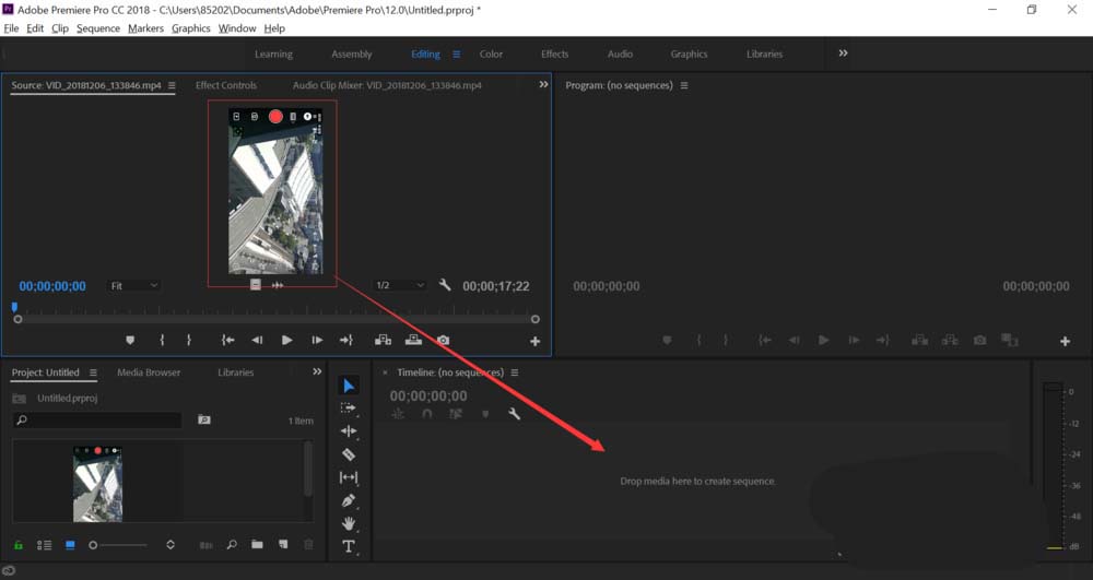 3、接着,我们将导入的视频从源文件框拖拽到时间轴框,如下图所示。视频加入时间轴方框后方可编辑