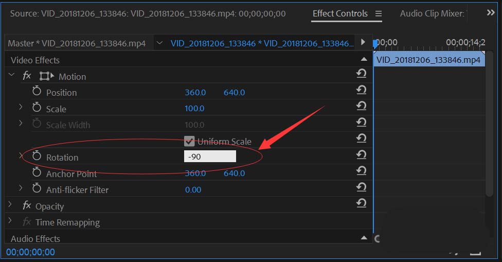 5、在效果控制页面中,选中旋转的编辑框,输入-90,即为将视频逆时针旋转90度