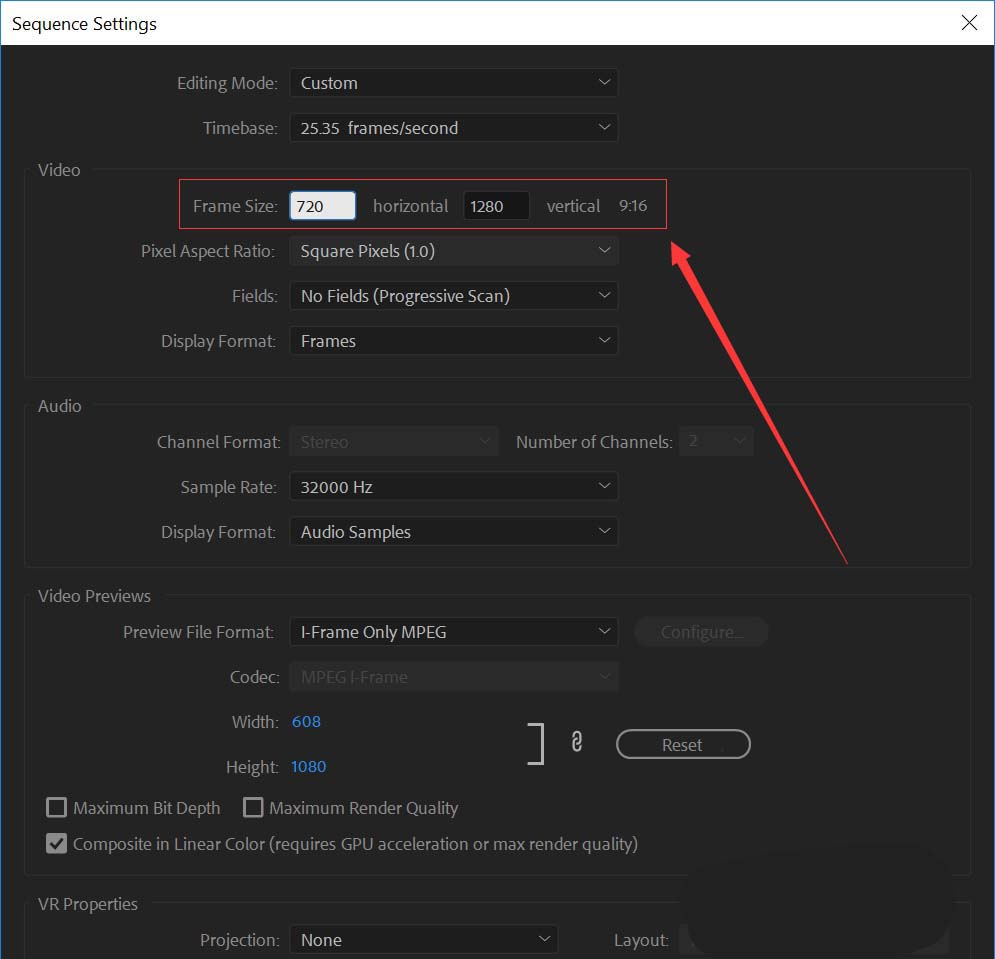 7、在序列设置菜单中,将帧大小文本框中的水平和垂直数值交换一下,例如720*1280的原数值视频旋转后就应该为1280*720