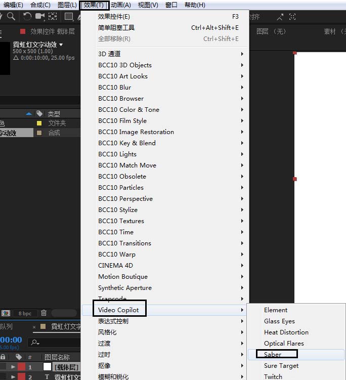 4、选中纯色层,添加saber效果;效果-video copilot-saber