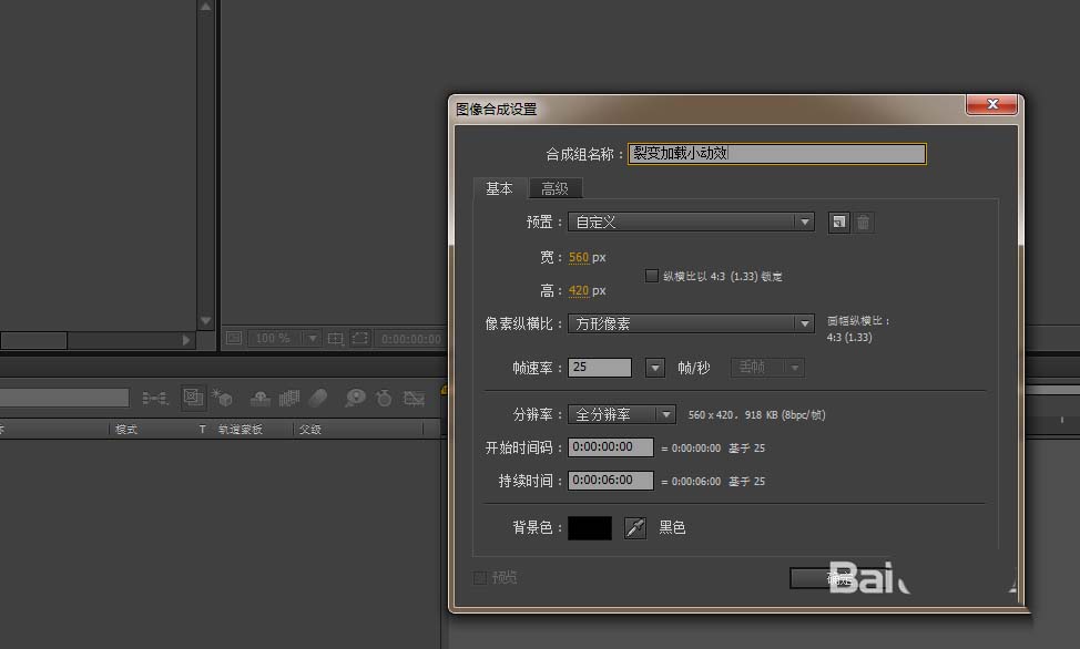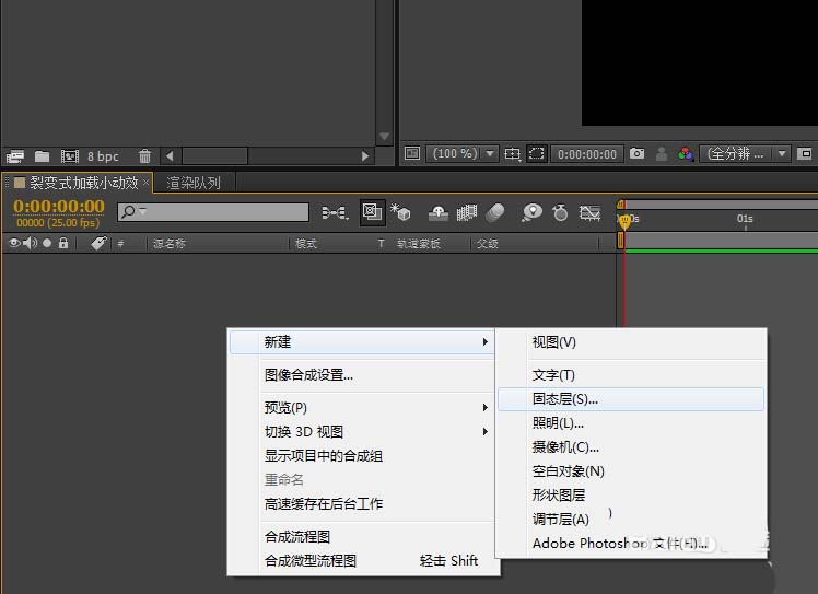 1、CTRL+N新建一个合成,命名为裂变式加载小动效,右击时间线新建一个固态层。
