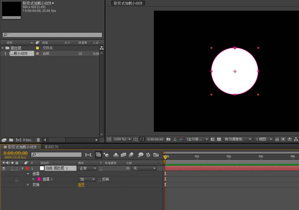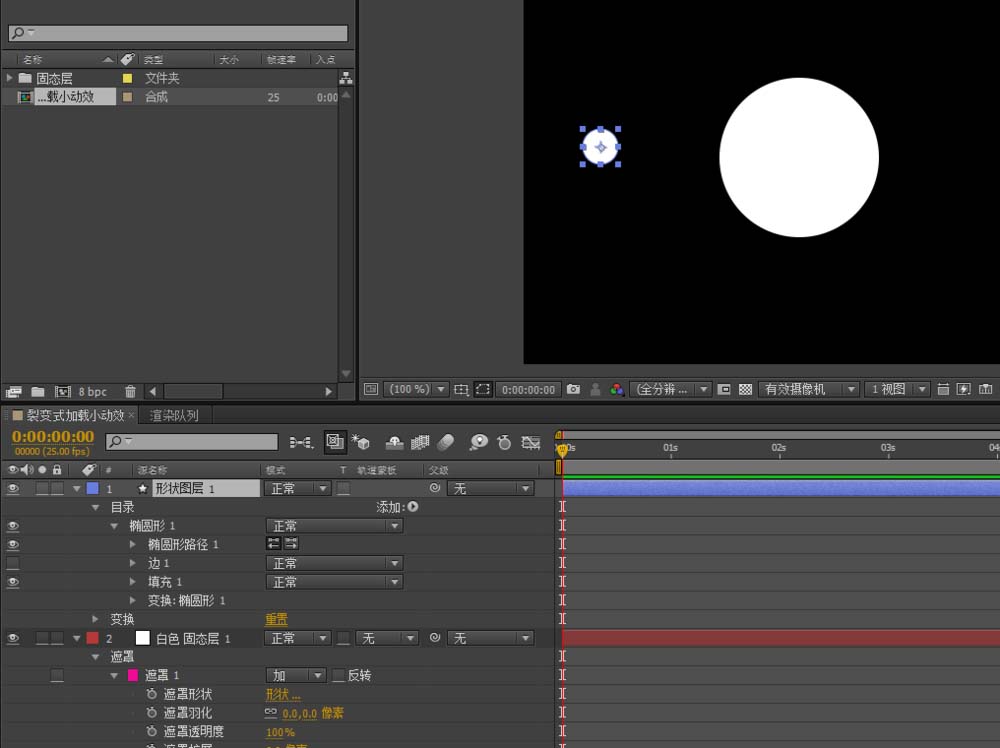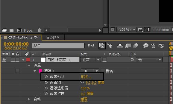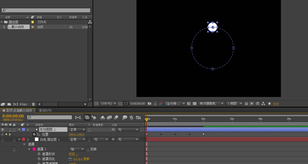 3、展开遮罩下拉,选中遮罩形状,CTRL+C复制路径,然后选中圆形图形图层P键打开位置属性,CTRL+V黏贴路径,同时关闭固态图层,这里固态层起到一个路径过度作用。