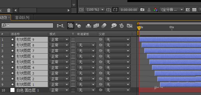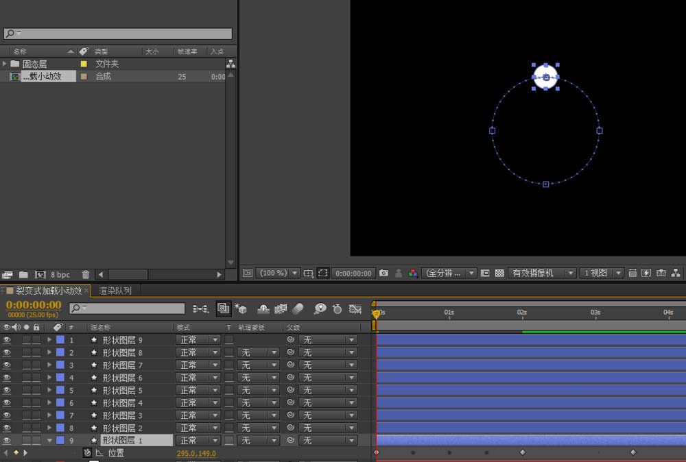 4、这个时候刚刚固态图层所画的路径就连同关键帧一起复制到小圆上了,选中形状图层,CTRL+D复制9个图层。