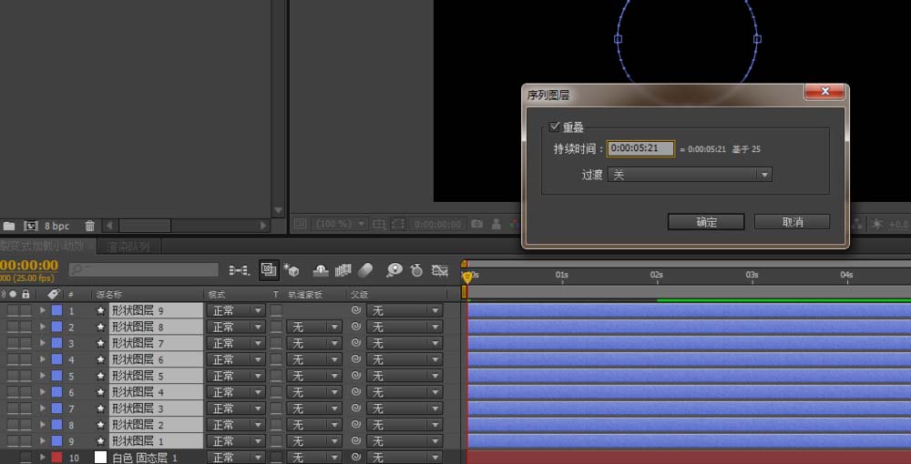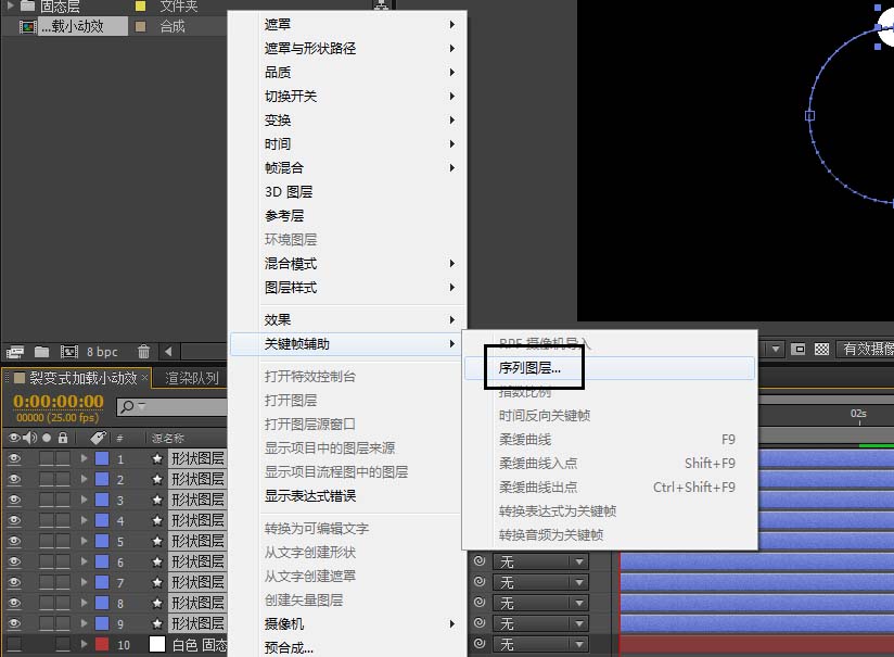 5、选中9个形状图层,右击关键帧辅助,选择系列图层,选择时间点,每个图层间隔4帧。
