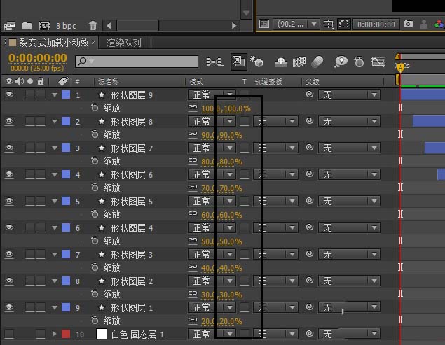 6、继续选中所有形状图层,同时打开S键,依次将每层的缩放值进行单独的有规律的调整,选中所有图层,同时打开T键,从0到100,K两个关键帧,这样有个慢慢显示的效果,按下空格键,就可以预览效果了。