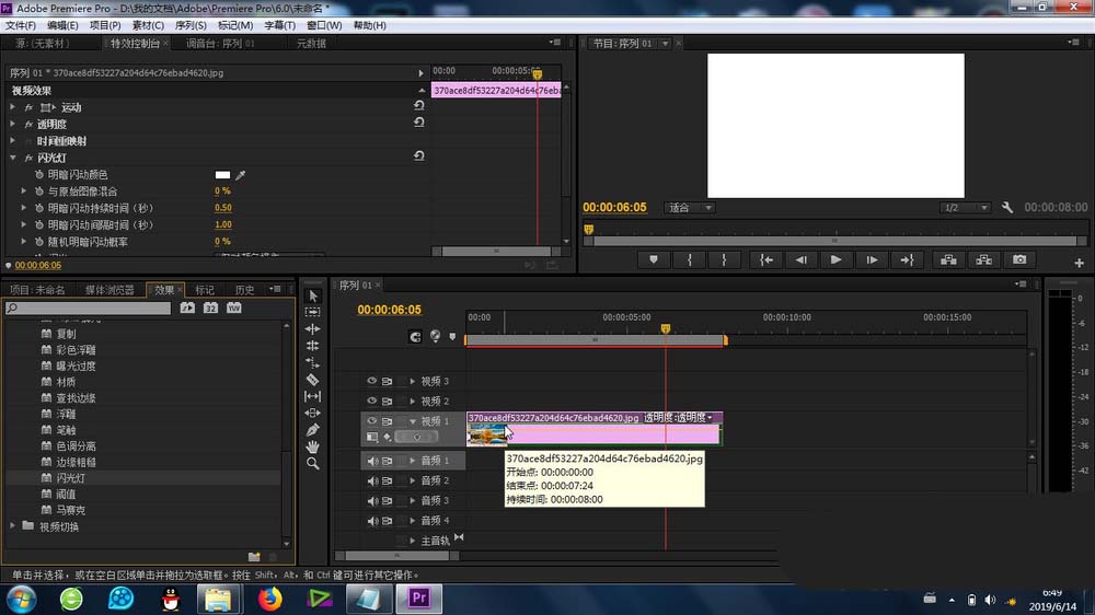 4、接下来就是关键的效果添加,拖动“闪光灯”效果到素材上即可