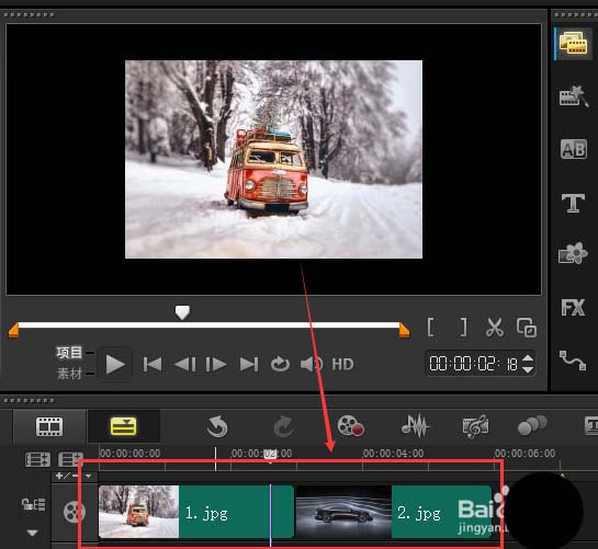 1、首先,我们先添加视频素材,这里我添加了两种图片