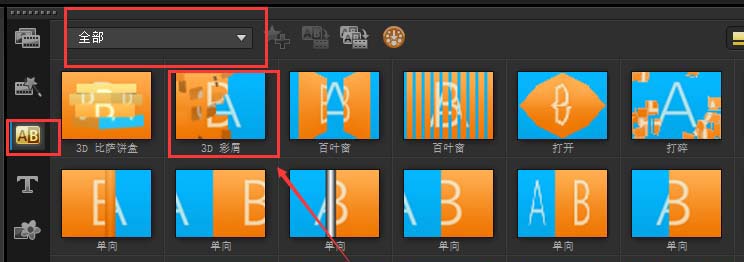 3、然后点击转场,选择全部,然后找到3D彩屑这个选项。