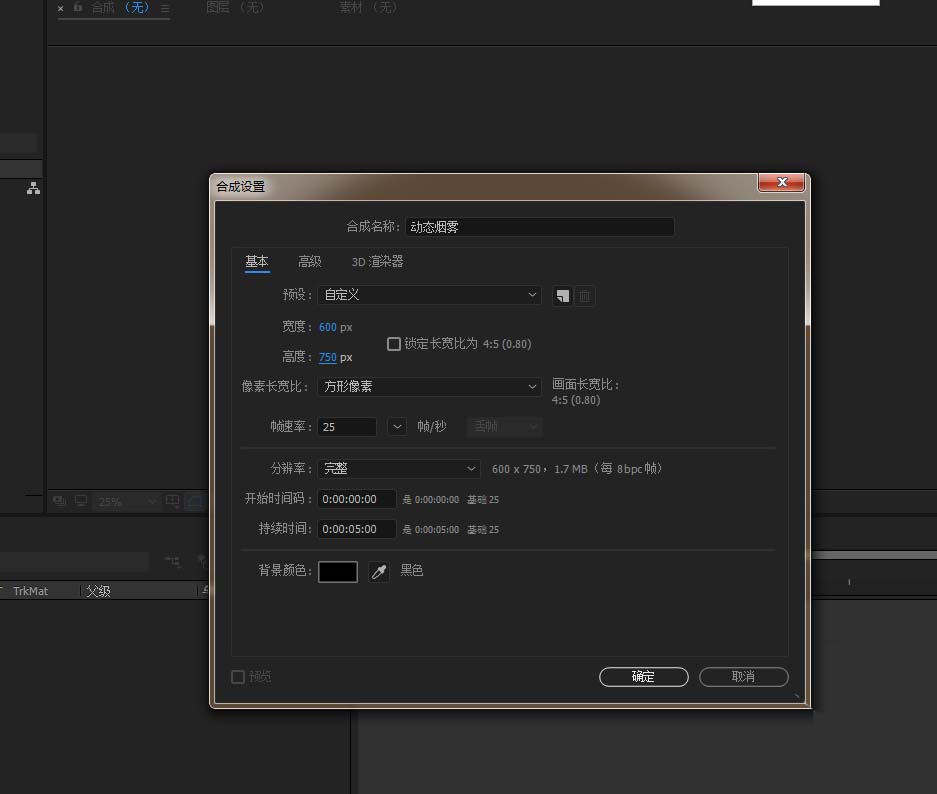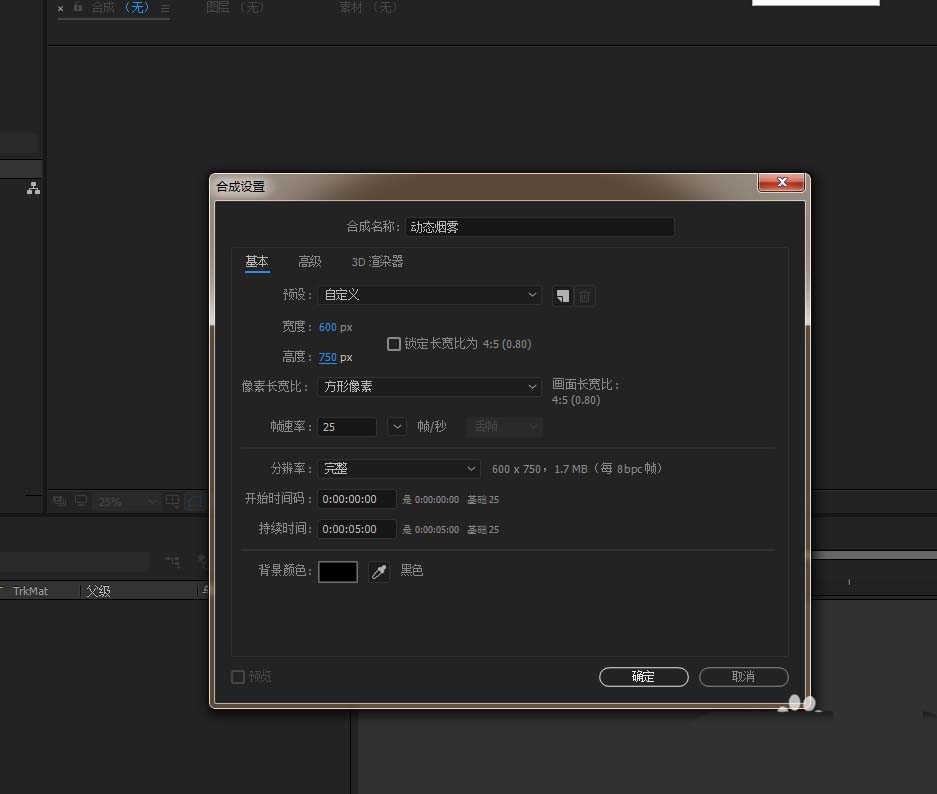 1、打开AE软件,新建合成,命名动态烟雾,调整相应的参数。