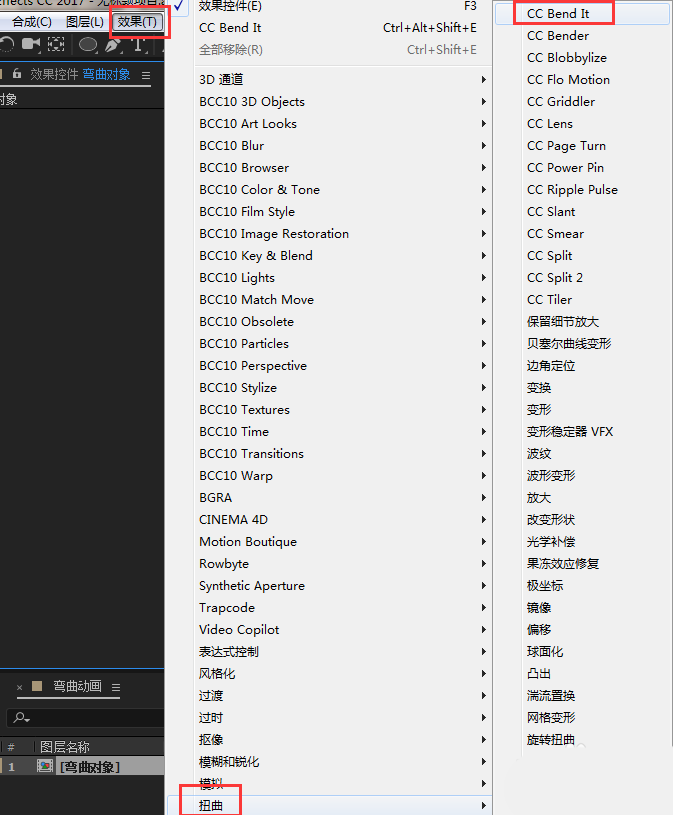 3、选中预合成,添加cc bend it 效果;效果-扭曲-cc bent it;