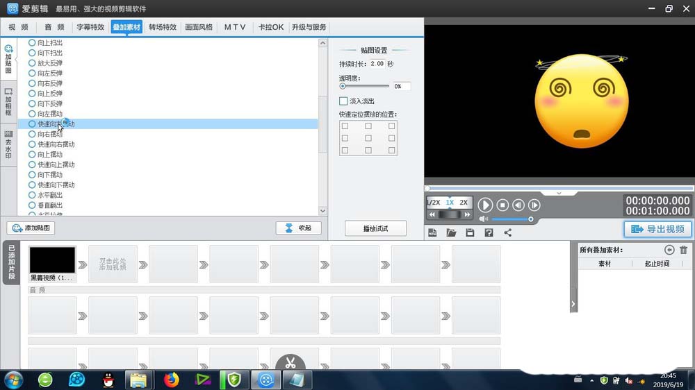 1、其实这个快速向左摆动效果在剪辑软件里面是很容易实现的。这个效果的存在位置是:叠加特效-加贴图特效-常用特效,一定要找到