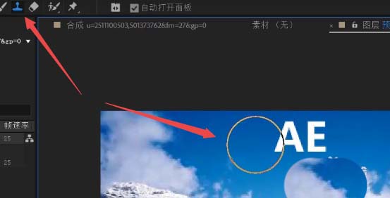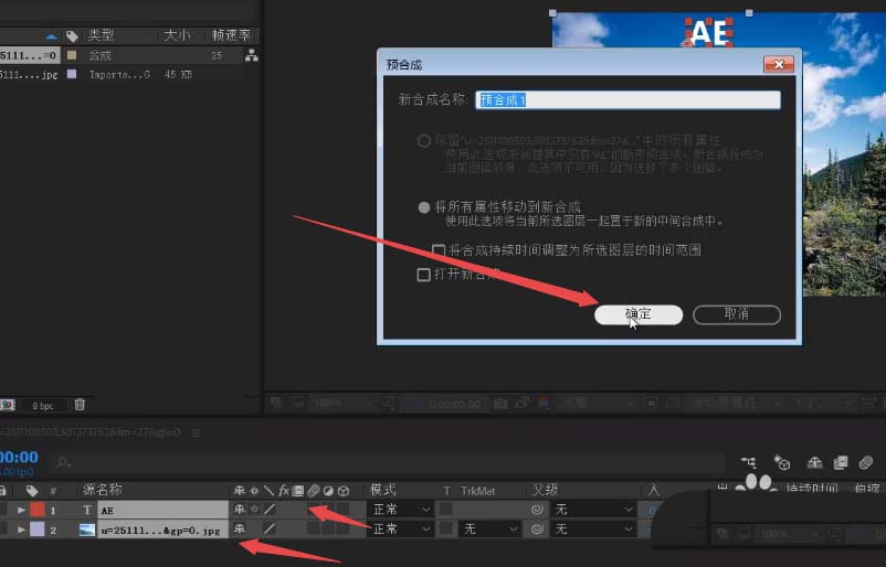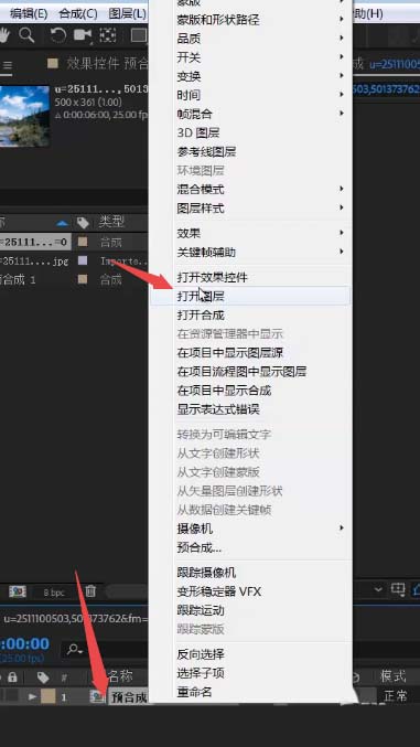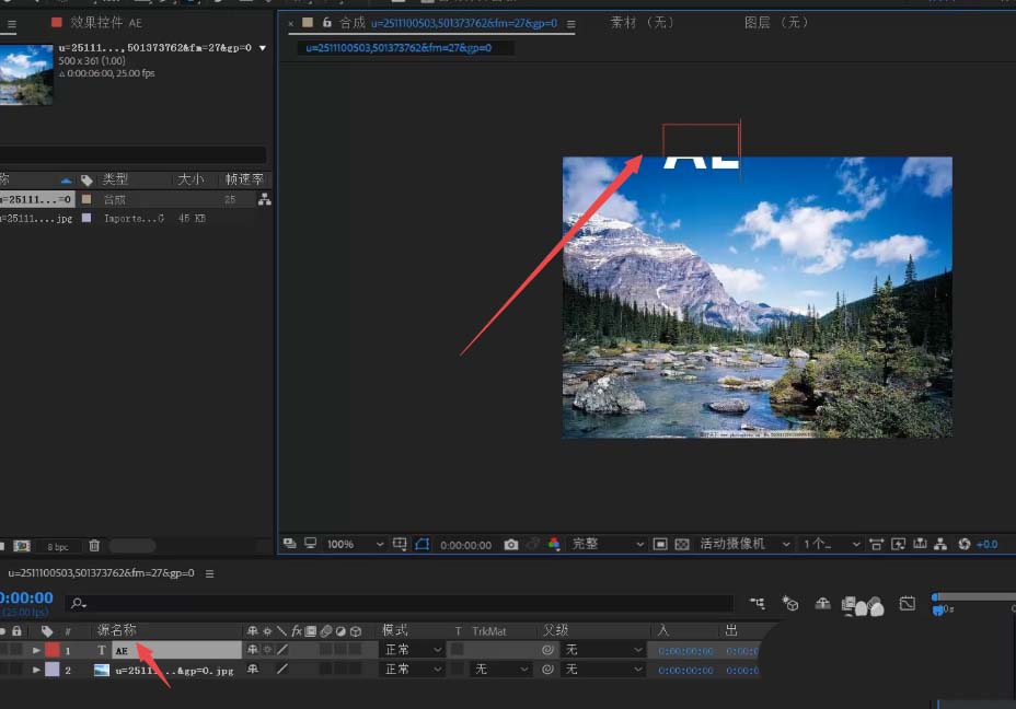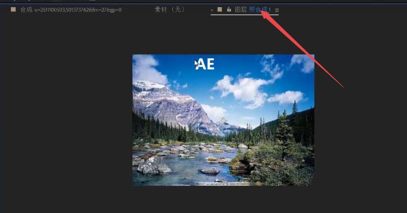 5、那现在这个ae就成了水印了,那现在这个文字没有打印在树上上面,它周围是空的,像这种情况,我们可以把鼠标移到预合成,点击右键,点击进入图层