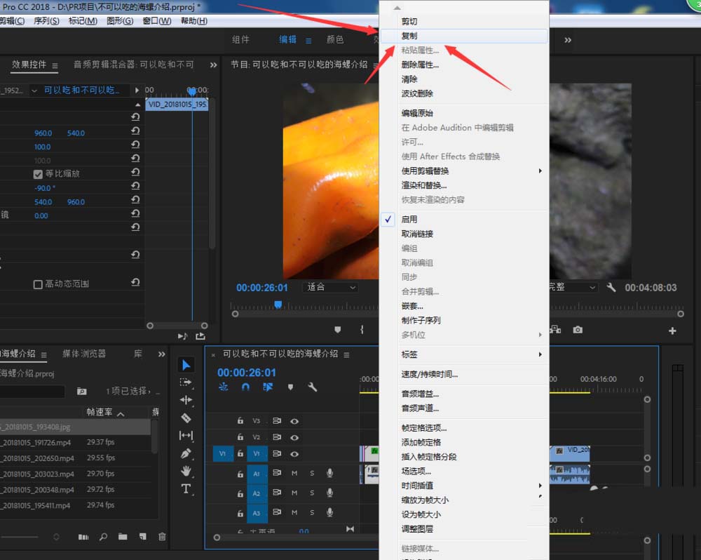 4、调整好一段视频素材后,右键,在最上面找到复制。点击复制后,回到时间轴上,选中要批量调整曝光的素材片段,看我图片的箭头吧,