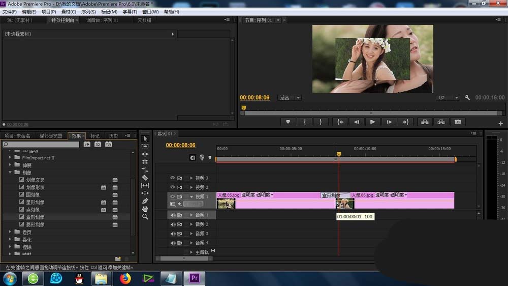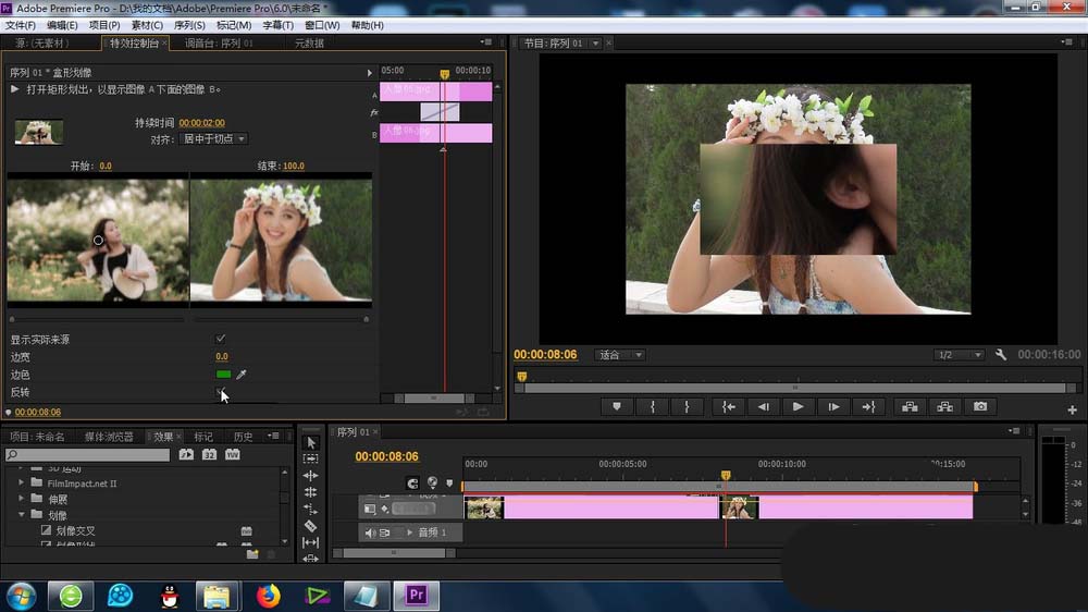 4、将“盒形划像”的功能拖拽到素材上面,形成默认的效果