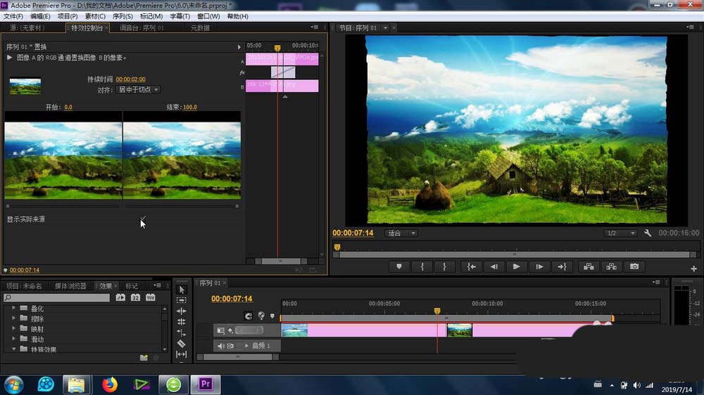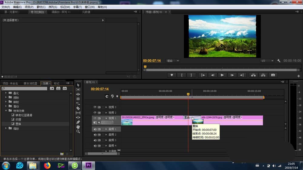 1、要做效果,一定要知道这个“置换转场”功能的位置:效果-视频切换-特殊效果-置换转场