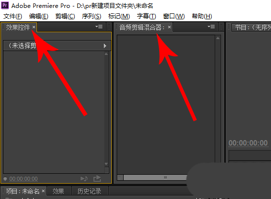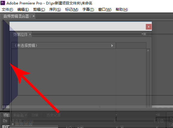 4、这时可以看到效果控件面板出现在了音频剪辑混合器面板的左侧,两个面板属于并列关系