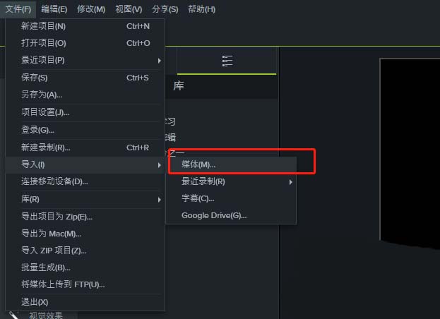 1、新建一个Camtasia 9空项目,选择文件中的导入,选择导入媒体这个选项。