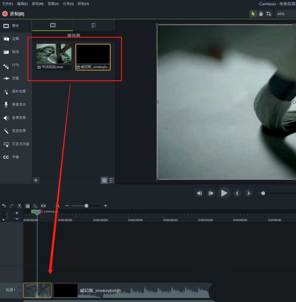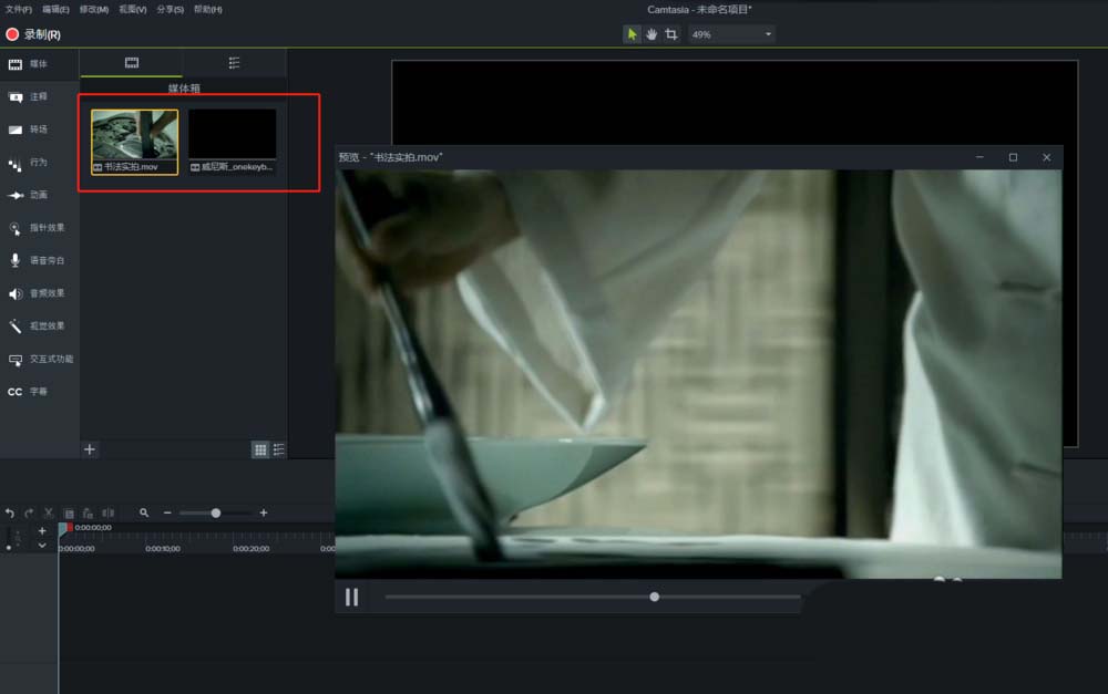 2、在Camtasia 9中导入两个不一样的视频素材,并且还可以鼠标双击素材进行预览。