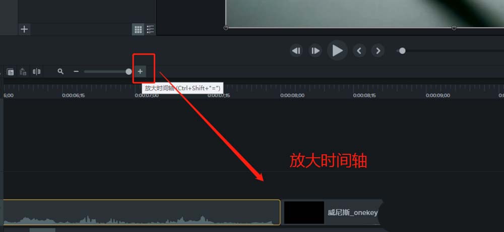 4、找到时间轴窗口的那个加号,点击放到时间轴到合适大小,并移到时间轴到需要添加转场的位置。