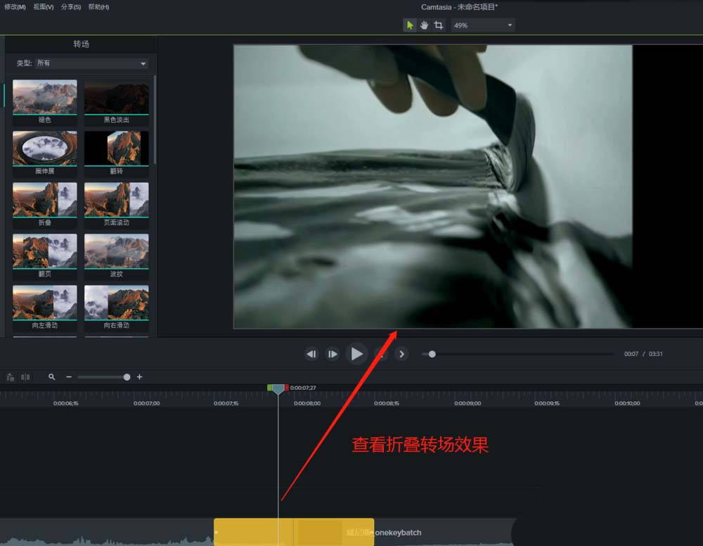 6、将时间轴的播放开始移动到转场开始的地方,播放查看效果。这个折叠转场就添加完成了。